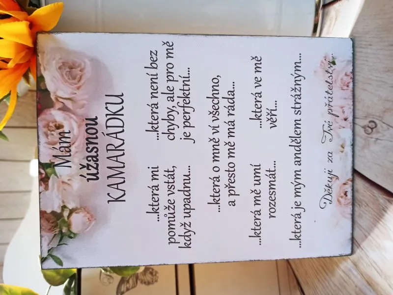 Dřevěná buková destička - obrázek s natištěným textem o rozměrech 13x18 cm pro vaší skvělou kamarádku. Vzadu háček na pověšení nebo ji můžete jen tak opřít na poličku nebo pracovní stůl.