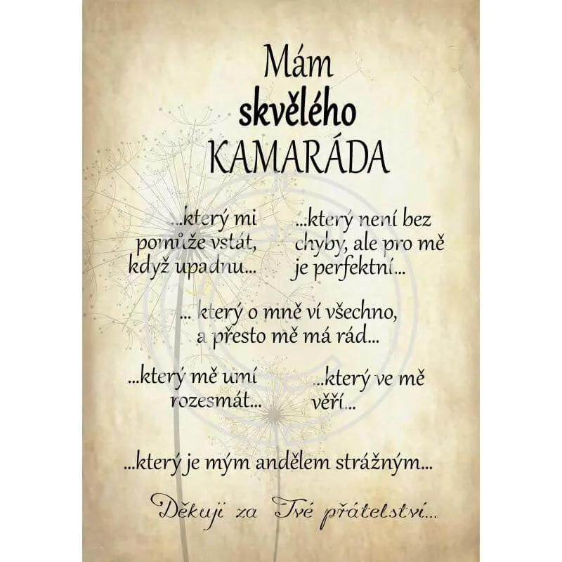 Chcete-li obdarovat svého kamráda, toto je ten pravý dárek. Dřevěná destička s krásným textem o rozměru 13x18 cm. Lze pověsit nebo postavit na poličku či pracovní stůl.
