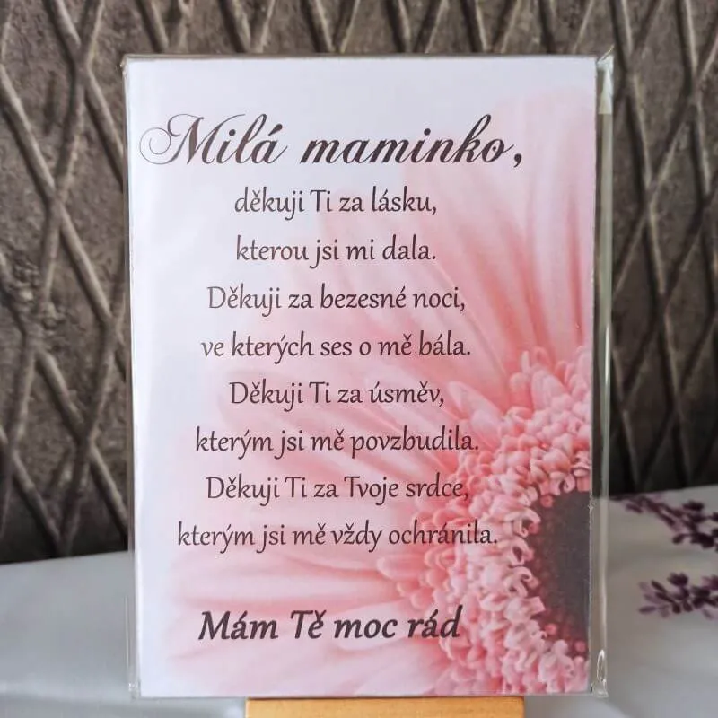Dřevěná buková destička - obrázek s natištěným textem pro vaši maminku a jemnou růžovou květinou.