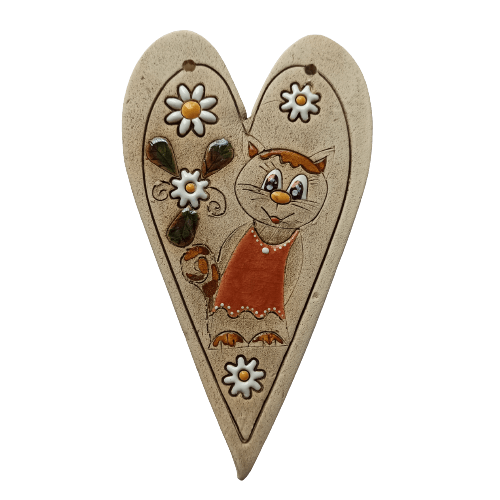 Keramické ručně dělané srdíčko k zavěšení s dekorem kytiček a kočičky. Detaily glazované. V horní části srdíčka jsou dvě malé dírky pro pověšení.