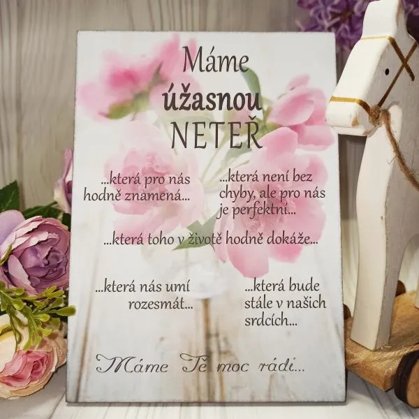 Dřevěná buková destička - obrázek s natištěným textem o rozměrech 13x18 cm pro vaši milou neteř. Vzadu háček na pověšení nebo ji můžete jen tak opřít na poličku nebo pracovní stůl.